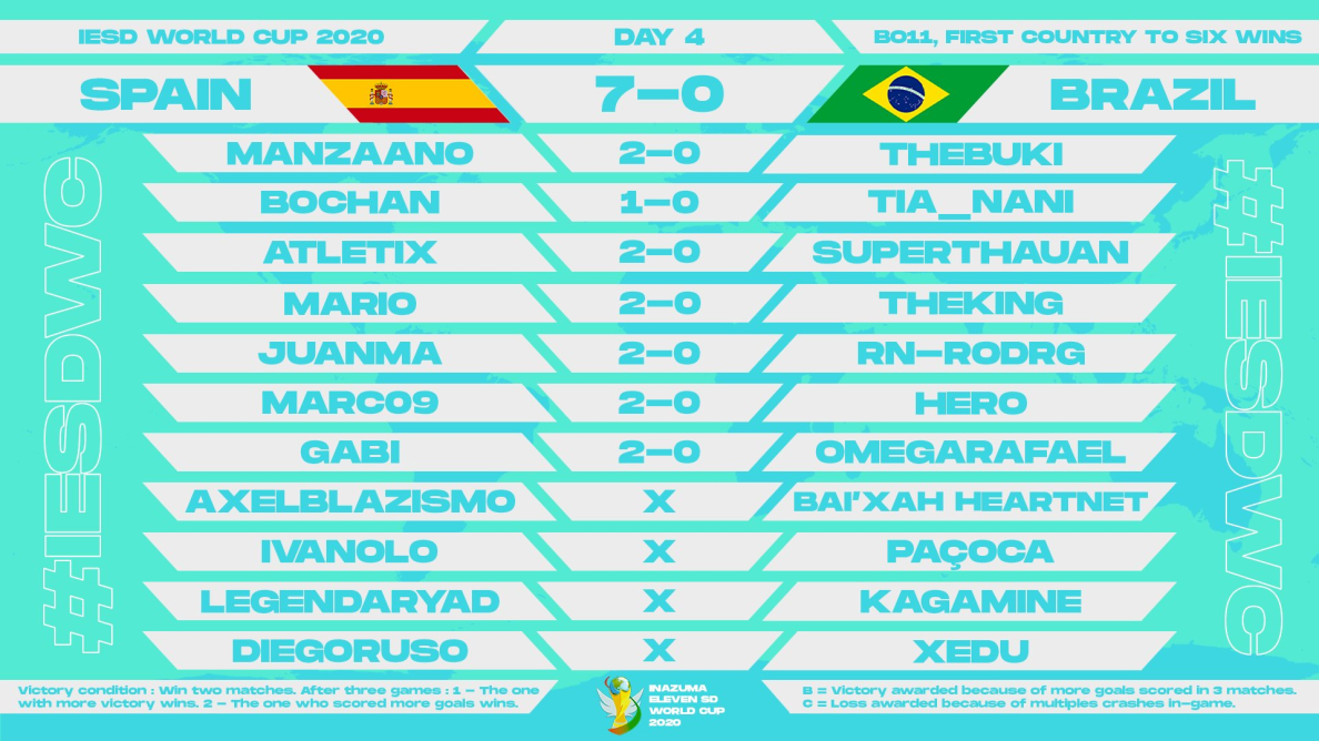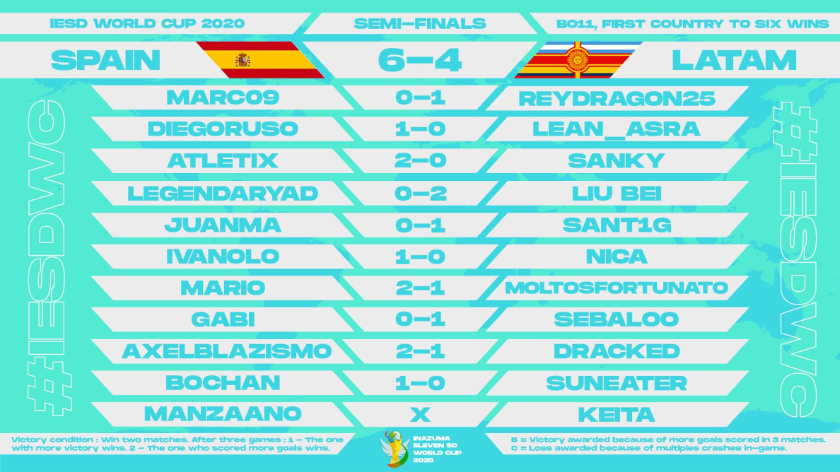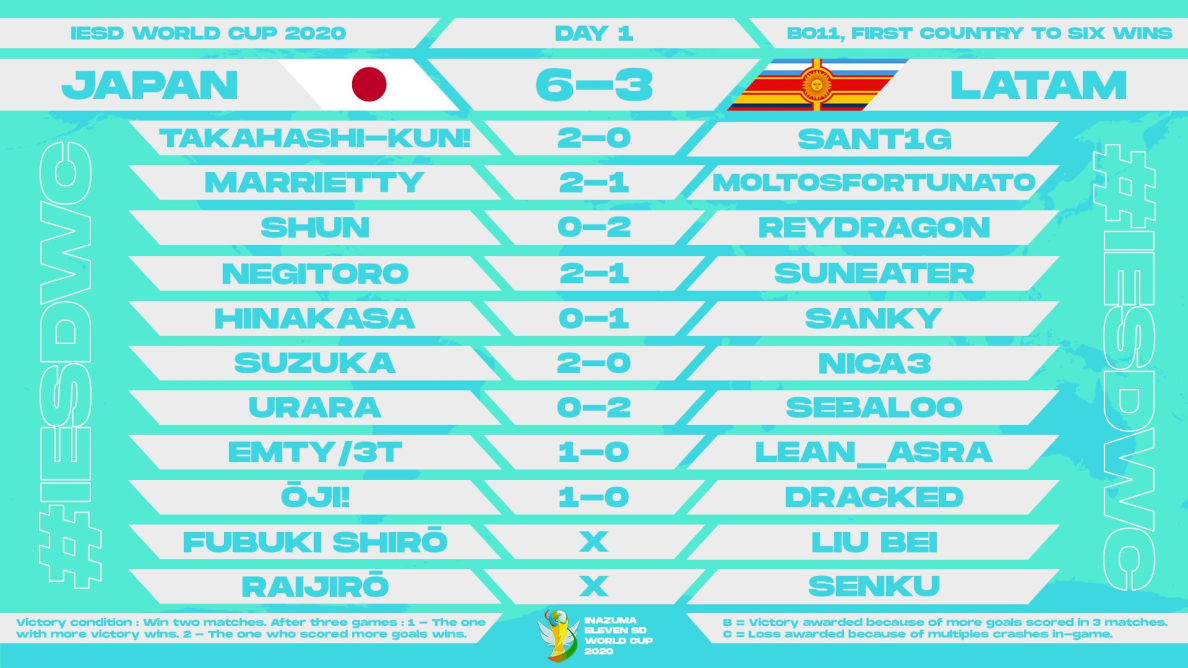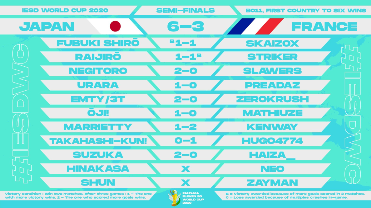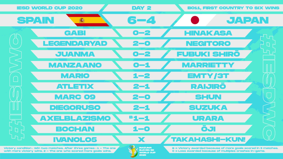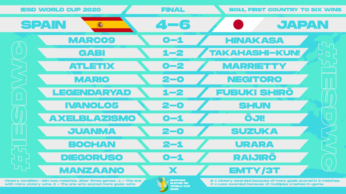 The Inazuma Eleven SD World Cup was organised in August 2020 by Juanma10. It was the first World Cup to be organised in the community. It consisted of 5 countries of more than 10 players per teams, all within one single group and the 4 first of the group would progress to the final stage. It was won by Japan, with behind them Spain, France and South America.