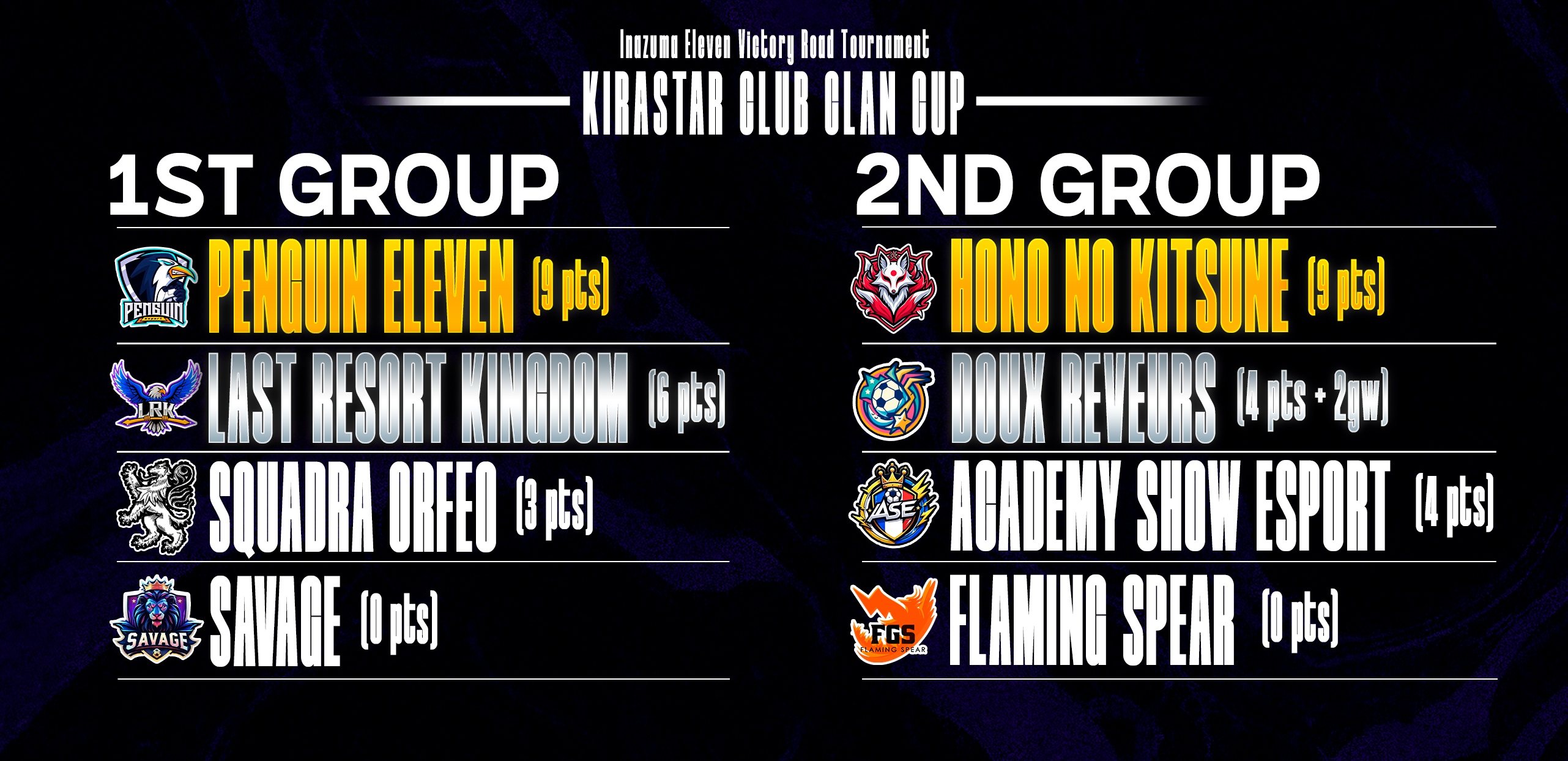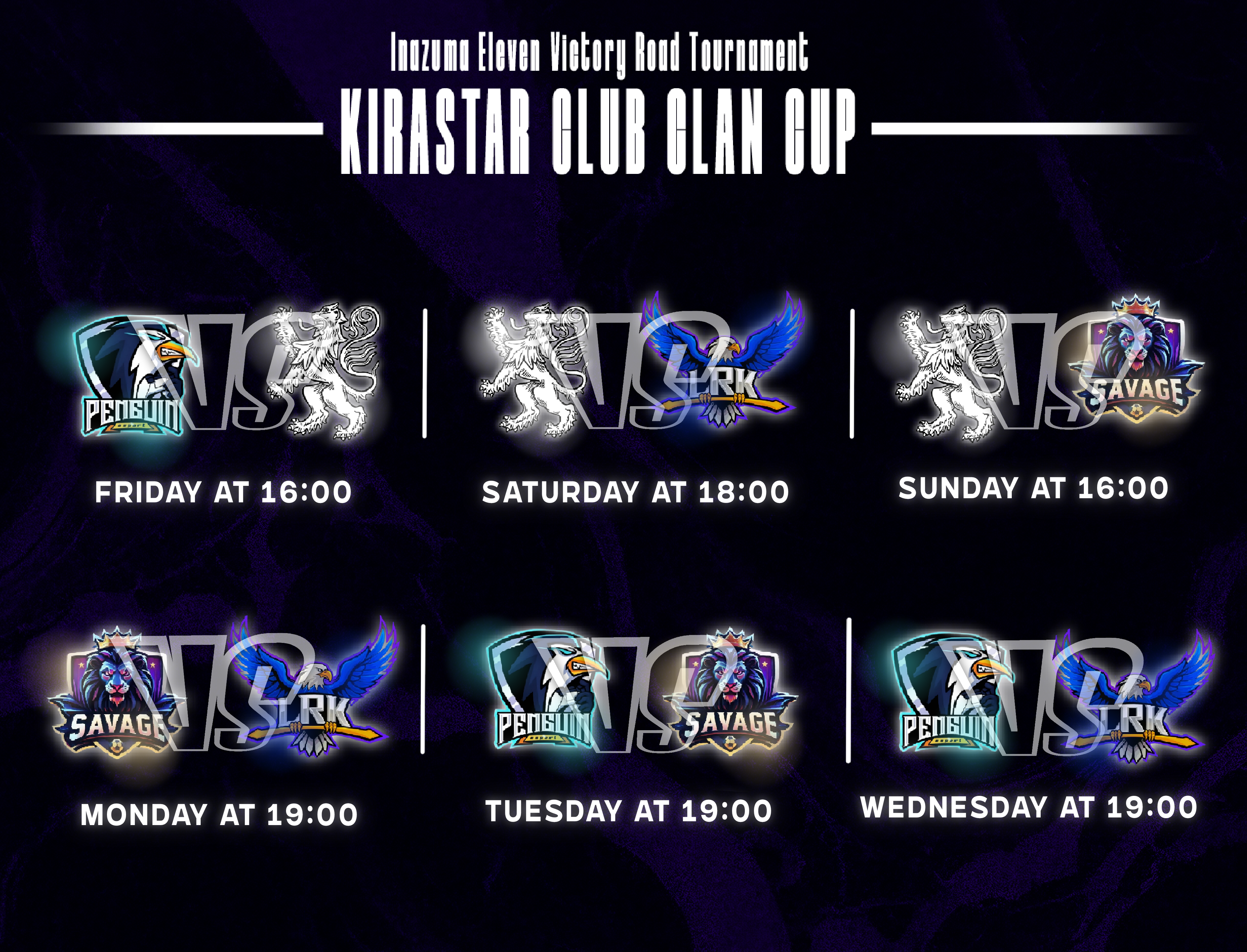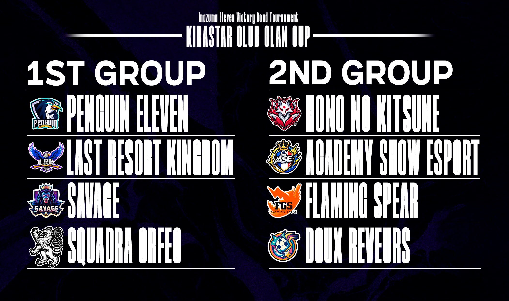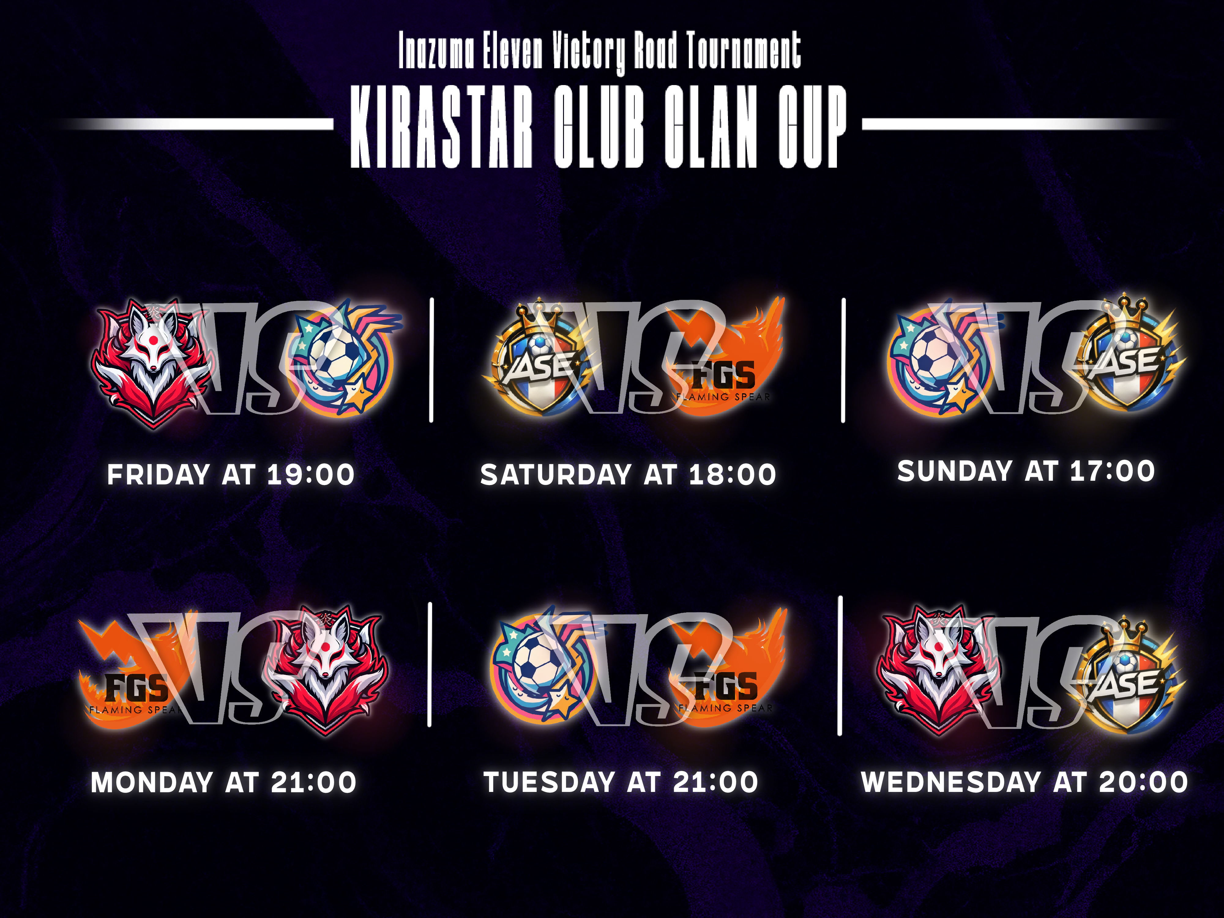 The Kirastar Club Clan Cup is an event hosted by unaiibby and his crew Belial & Yisus. This event's goal is to determine the strongest clan in the current Inazuma Eleven competition. In this tournament, the top five players from each Inazuma Eleven Victory Road competitive clan will compete against each other to determine the strongest. It consisted of 4 groups of 4 teams and the top 2 would go to the final stage.