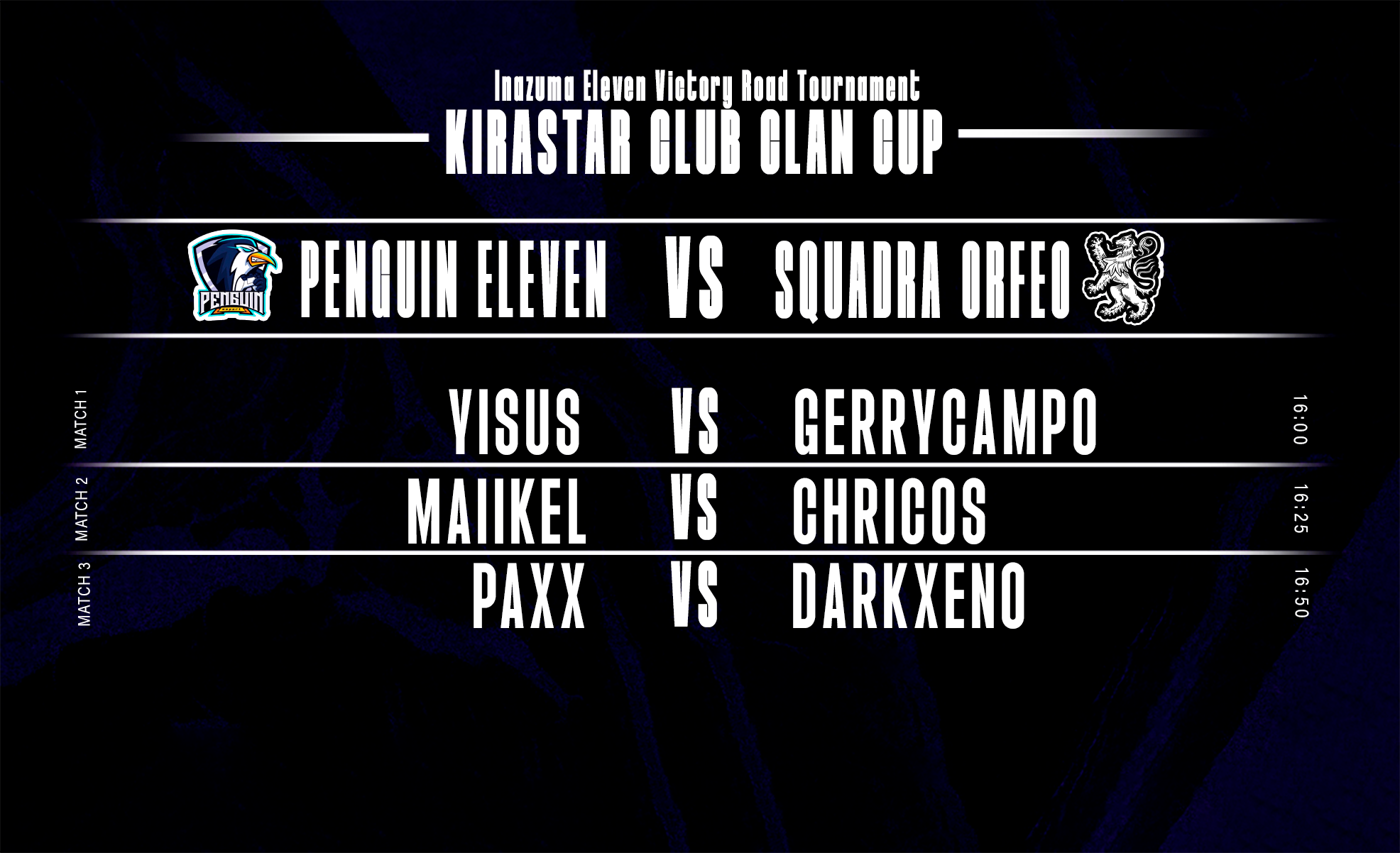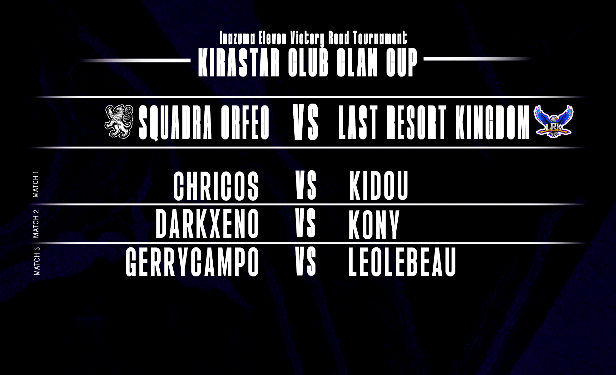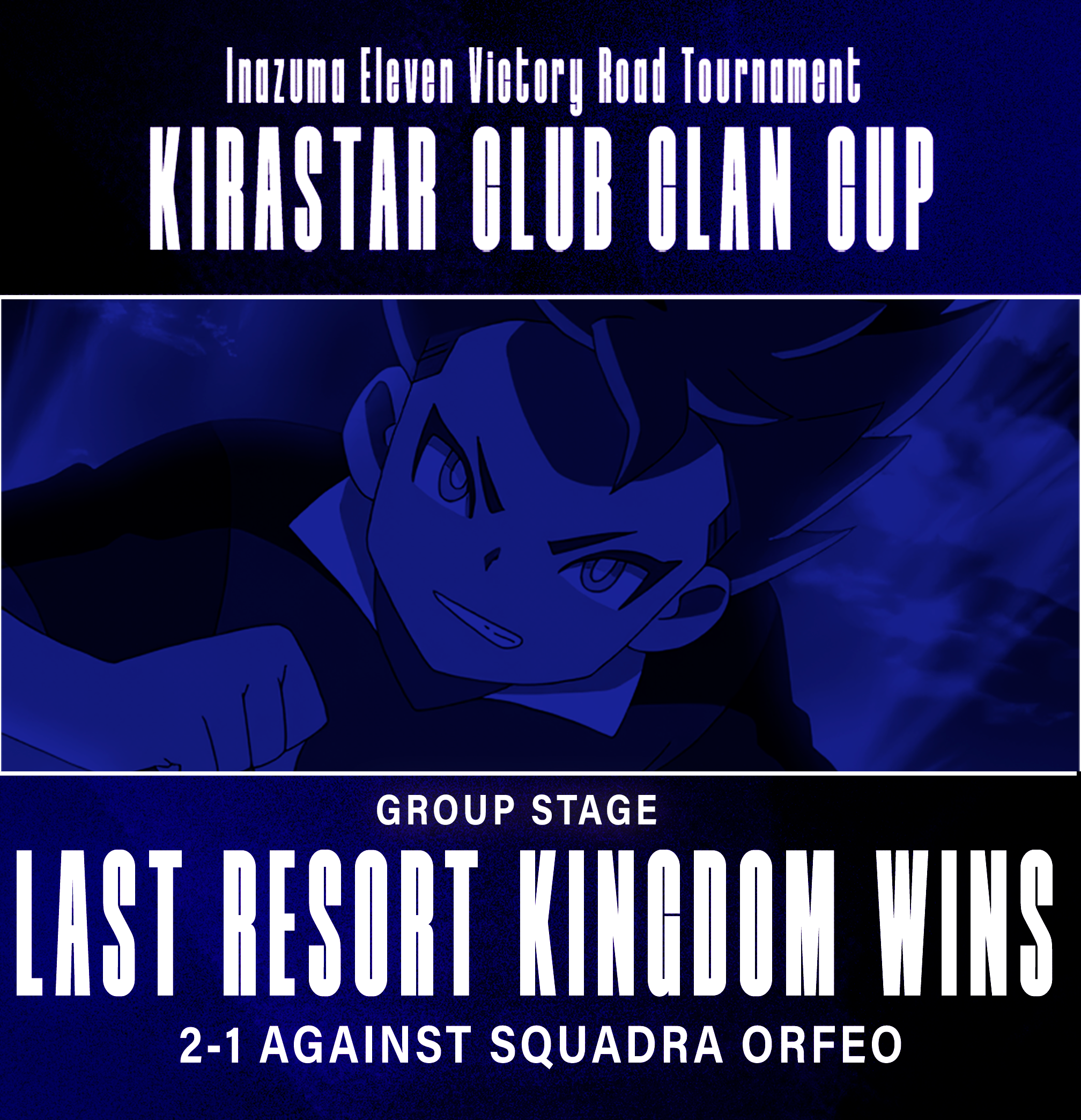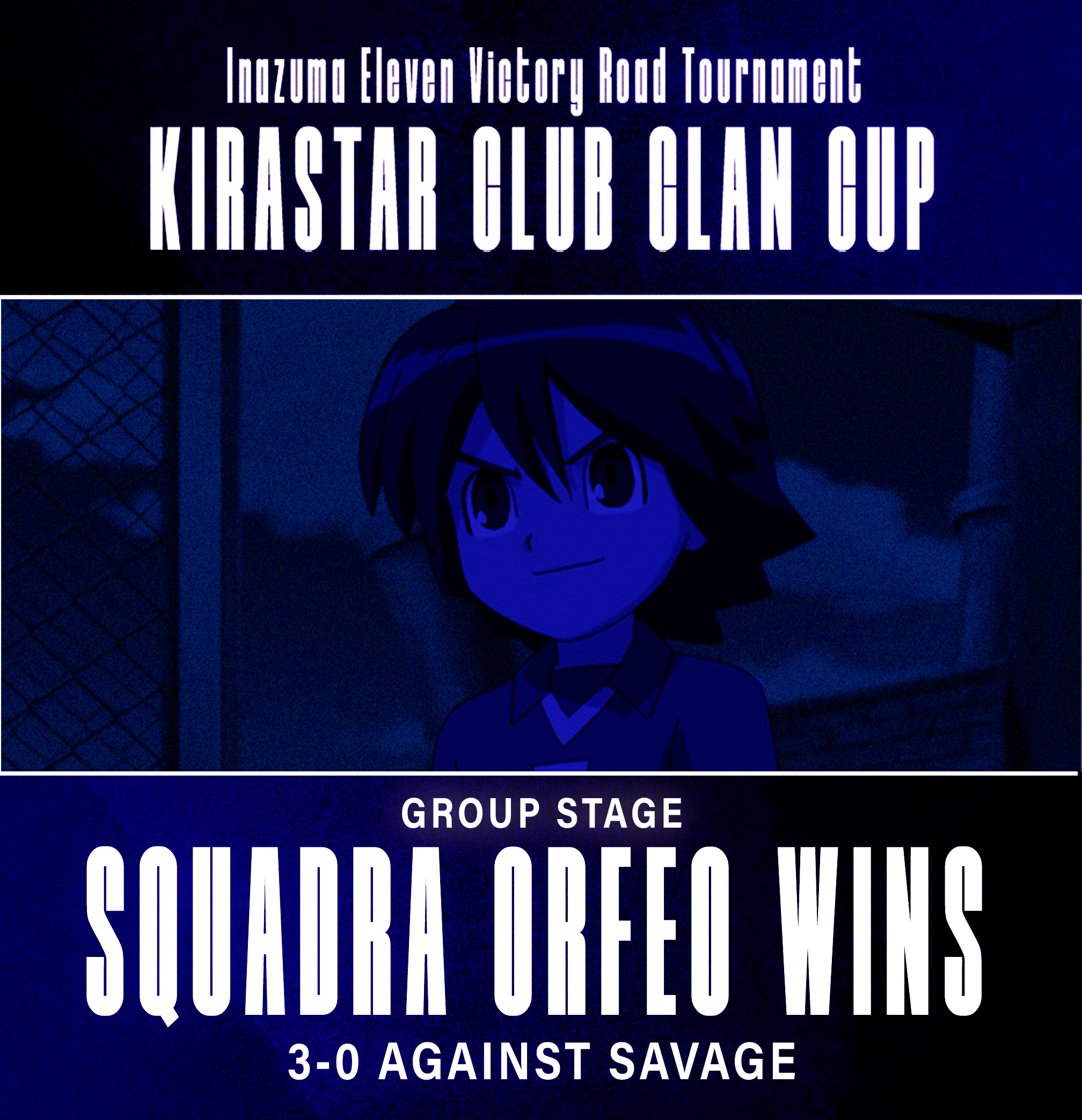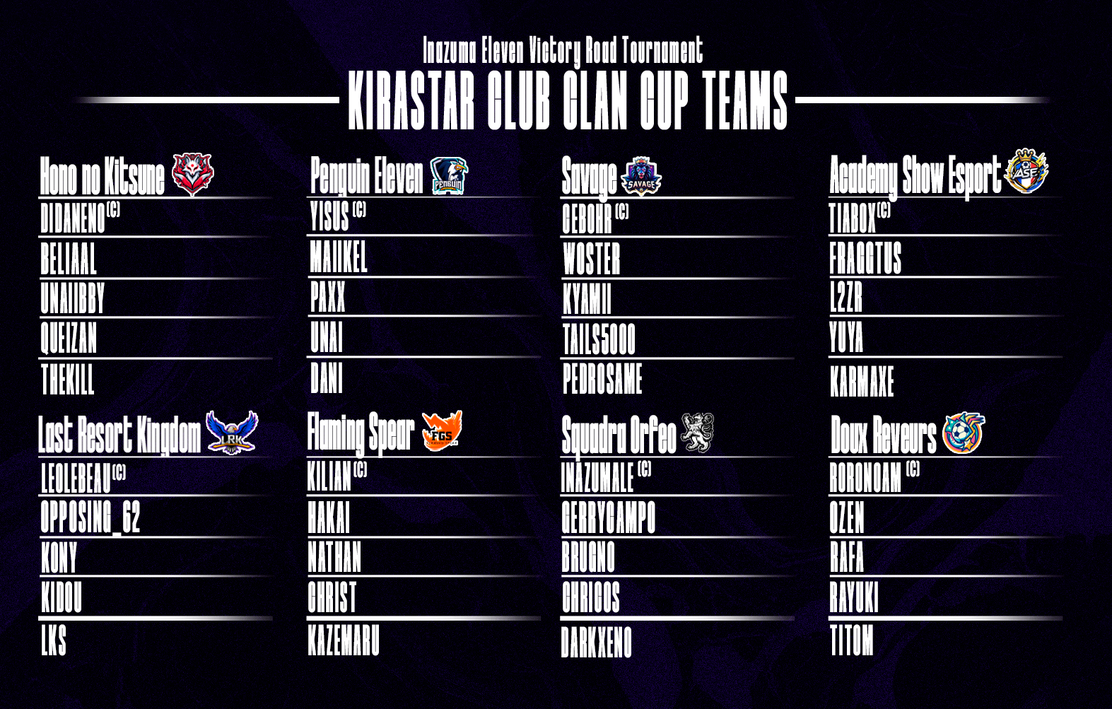 The Kirastar Club Clan Cup is an event hosted by unaiibby and his crew Belial & Yisus. This event's goal is to determine the strongest clan in the current Inazuma Eleven competition. In this tournament, the top five players from each Inazuma Eleven Victory Road competitive clan will compete against each other to determine the strongest. It consisted of 4 groups of 4 teams and the top 2 would go to the final stage.