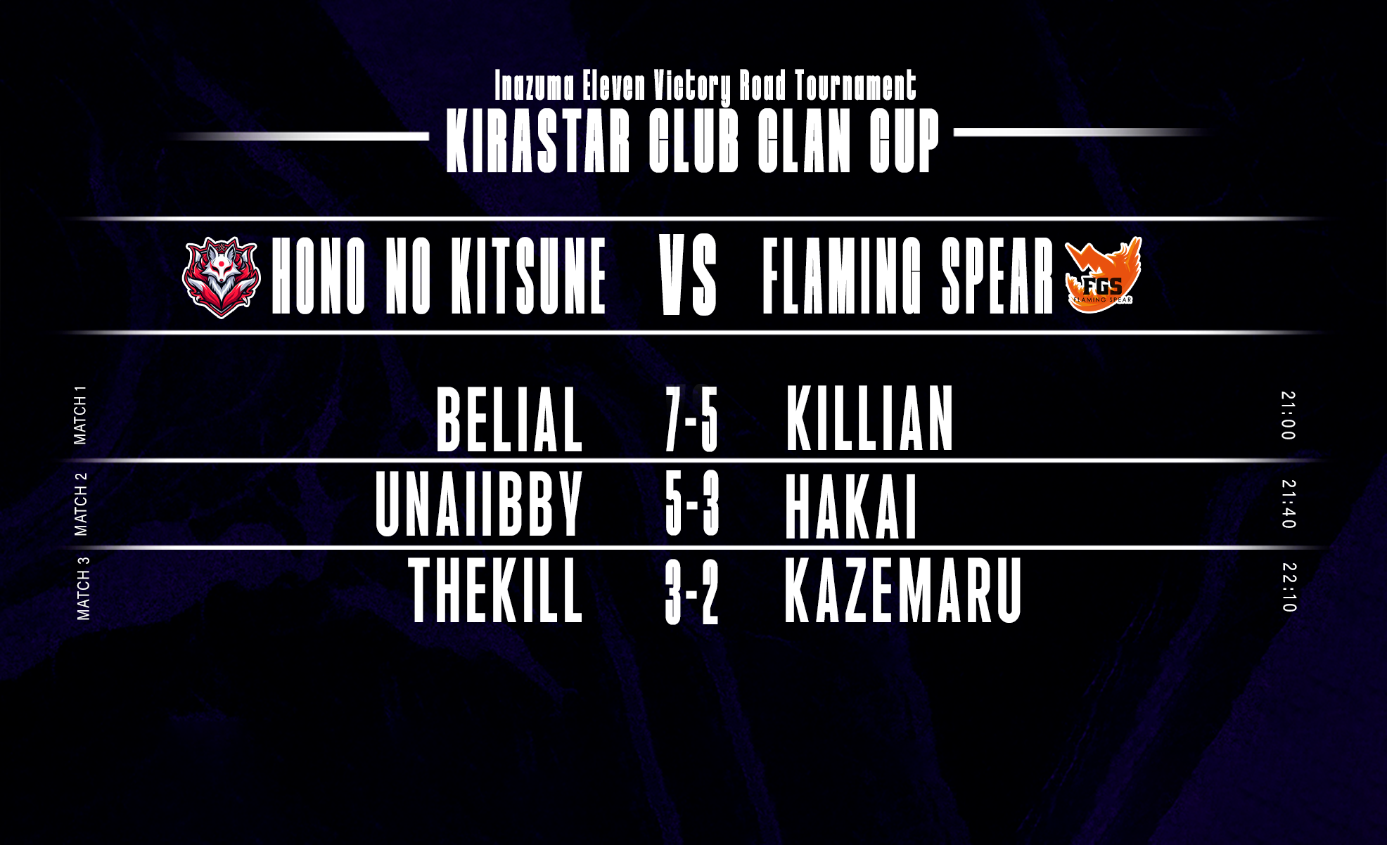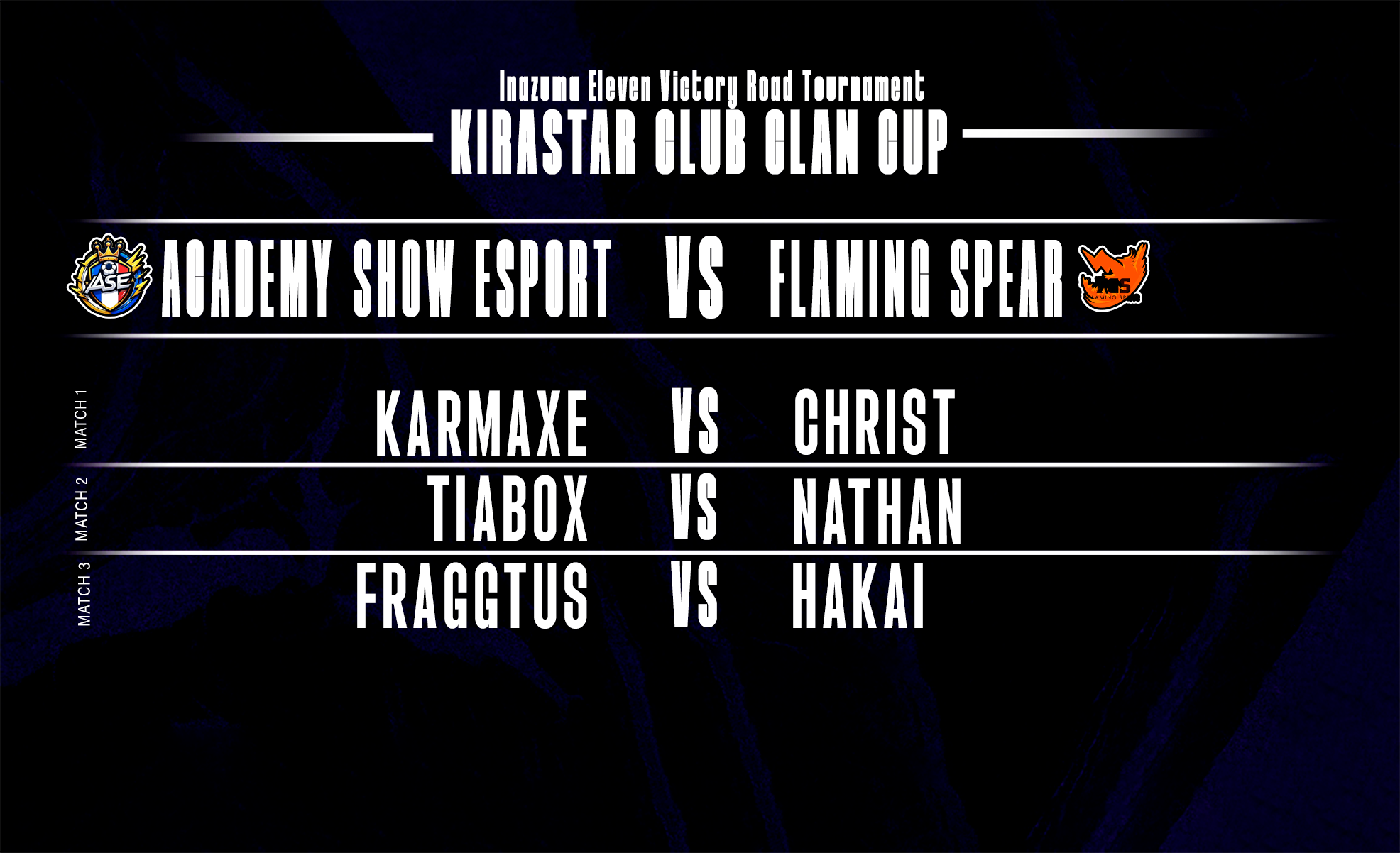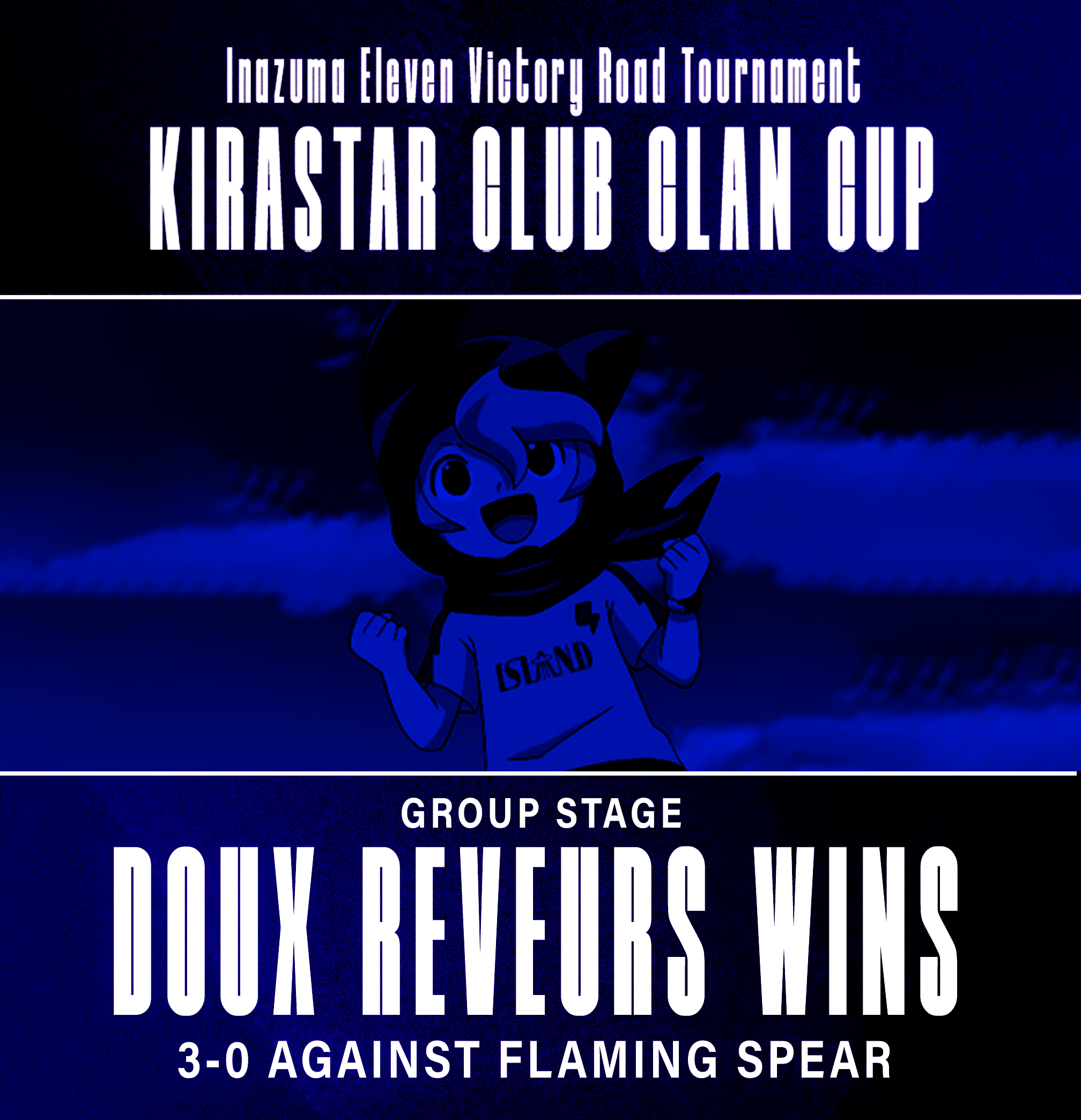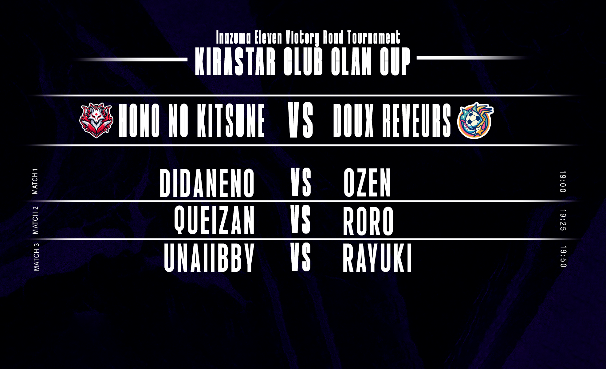 The Kirastar Club Clan Cup is an event hosted by unaiibby and his crew Belial & Yisus. This event's goal is to determine the strongest clan in the current Inazuma Eleven competition. In this tournament, the top five players from each Inazuma Eleven Victory Road competitive clan will compete against each other to determine the strongest. It consisted of 4 groups of 4 teams and the top 2 would go to the final stage.